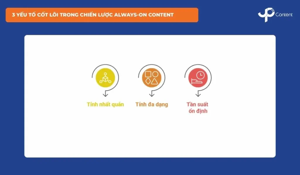 Chiến lược Always-on Content hiệu quả dựa trên 3 yếu tố cốt lõi: tính nhất quán, tính đa dạng và tần suất ổn định. 3 yếu tố này giúp nội dung vừa đồng bộ thương hiệu vừa đáp ứng nhu cầu đa dạng của người dùng.