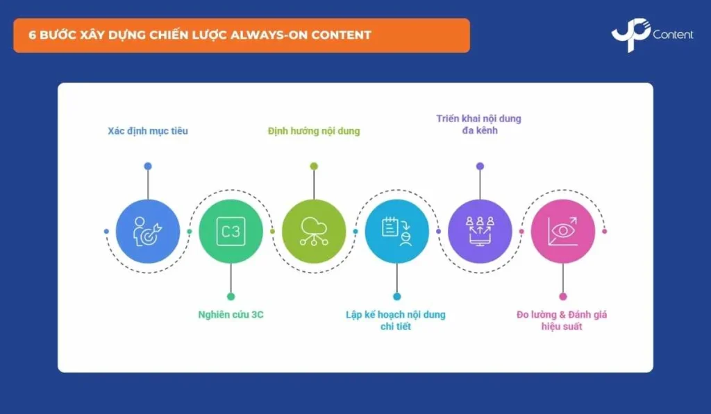 6 bước này giúp chuẩn hóa quy trình triển khai chiến lược Always-on Content, đảm bảo nội dung được xây dựng có định hướng, kiểm soát và tối ưu liên tục.