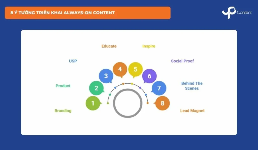 Always-on Content cần được cấu trúc theo trụ cột rõ ràng. Dưới đây là 8 nhóm nội dung cốt lõi giúp thương hiệu duy trì dòng chảy nội dung dài hạn: