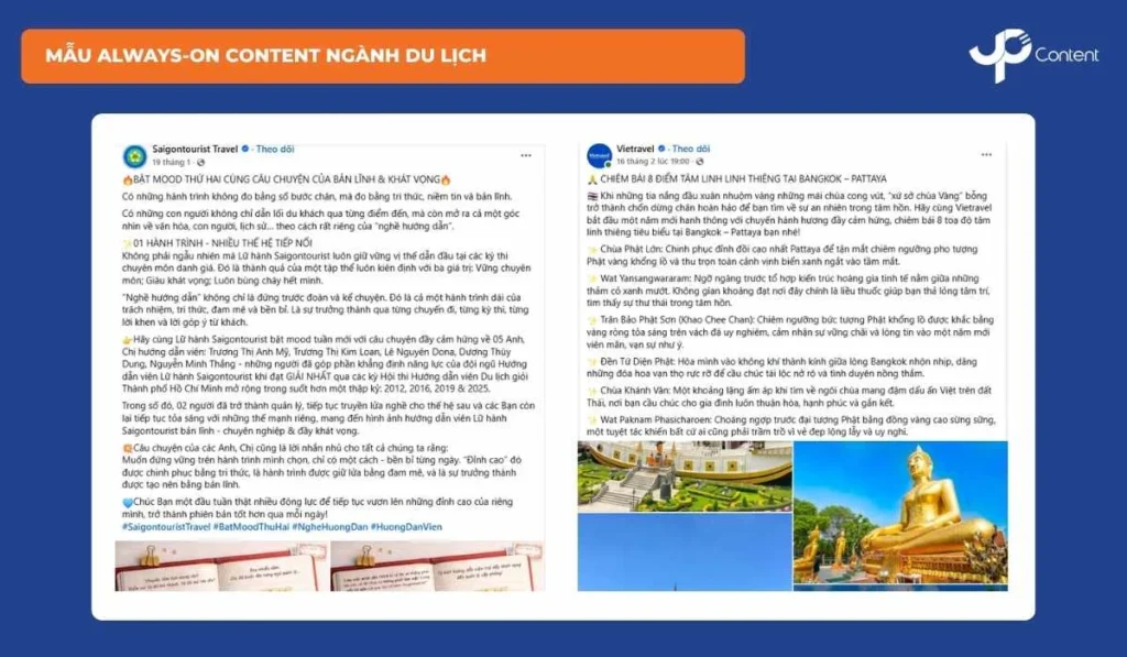Du lịch là ngành giàu trải nghiệm, phụ thuộc mạnh vào hình ảnh và cảm xúc. Always-on Content nên kết hợp Inspire (gợi ý điểm đến, cảm hứng xê dịch), Product (tour, combo cụ thể), Social Proof (review khách hàng) và Behind The Scenes (hậu trường hành trình). Nội dung cần khơi gợi “ham đi”, dễ lưu và chia sẻ, đồng thời cung cấp thông tin rõ ràng về lịch trình, chi phí và thời điểm phù hợp.