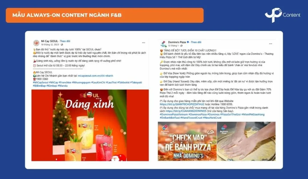 F&B có tần suất mua cao và quyết định nhanh, nên nội dung cần tập trung vào cảm xúc và hình ảnh. Chiến lược Always-on Content phù hợp theo tuyến nội dung Product (món mới, combo nổi bật), Behind The Scenes (bếp, nguyên liệu, quy trình chế biến) và Branding (câu chuyện quán, triết lý phục vụ). Hình ảnh cần hấp dẫn, thông điệp rõ ràng và dễ chia sẻ trên social để tăng độ lan tỏa tự nhiên.