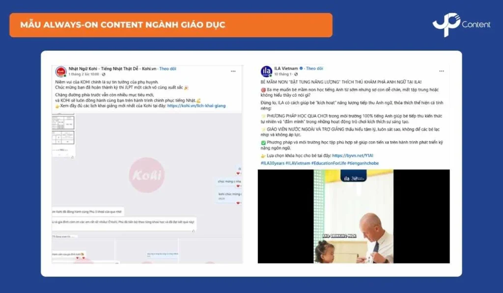 Giáo dục là ngành dựa trên niềm tin, với chu kỳ quyết định dài và nhiều câu hỏi cần giải đáp. Always-on Content nên kết hợp Educate (chia sẻ kiến thức miễn phí), Social Proof (kết quả học viên), Lead Magnet (ebook, tài liệu, bài test đầu vào) và Behind The Scenes (lớp học, giảng viên, phương pháp giảng dạy). Nội dung cần thể hiện năng lực chuyên môn rõ ràng, sử dụng ví dụ thực tế và quy trình minh bạch.