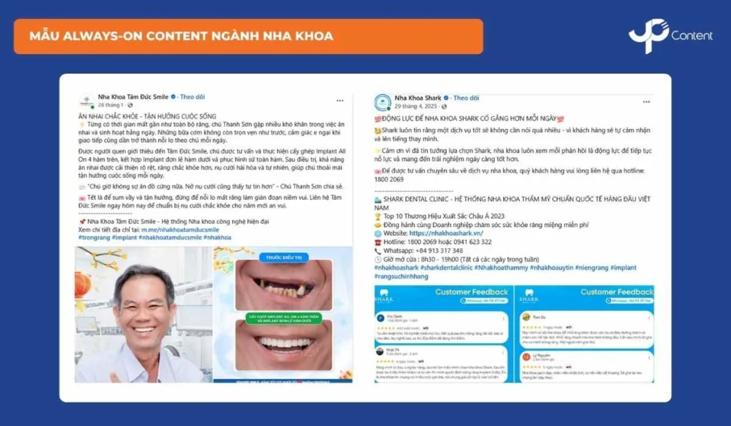 Khách hàng nha khoa thường lo ngại về đau và rủi ro, vì vậy nội dung cần tạo cảm giác an tâm. Bạn có thể triển khai content nha khoa theo hướng Educate (giải thích quy trình điều trị, kiến thức chăm sóc răng miệng), Social Proof (case thực tế, hình ảnh trước-sau), Behind The Scenes (quy trình vô trùng, công nghệ sử dụng) và Product (dịch vụ chủ lực). Hình ảnh cần nhẹ nhàng, tránh gây sợ để đảm bảo trải nghiệm tích cực cho người xem.