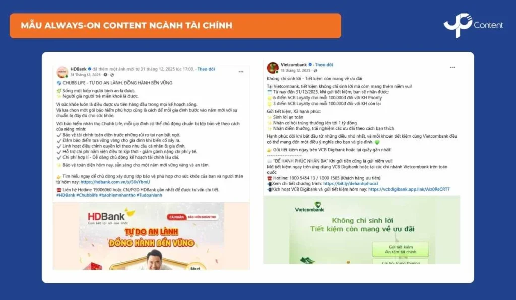 Tài chính là lĩnh vực phức tạp, đòi hỏi nội dung rõ ràng và mức độ tin cậy cao. Nội dung cần tập trung vào Educate (kiến thức tài chính cá nhân), Social Proof (case thực tế) và Branding (giá trị bảo vệ, đồng hành dài hạn).