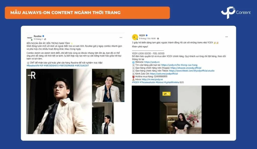 Thời trang xoay quanh phong cách, xu hướng và cá tính cá nhân. Always-on Content nên ưu tiên Inspire (OOTD, gợi ý mix & match), Product (giới thiệu bộ sưu tập), Social Proof (feedback khách hàng) và Behind The Scenes (photoshoot, quá trình thiết kế). Visual cần tập trung vào lookbook, video ngắn và hình ảnh before–after phối đồ để tăng tính ứng dụng và khả năng truyền cảm hứng.