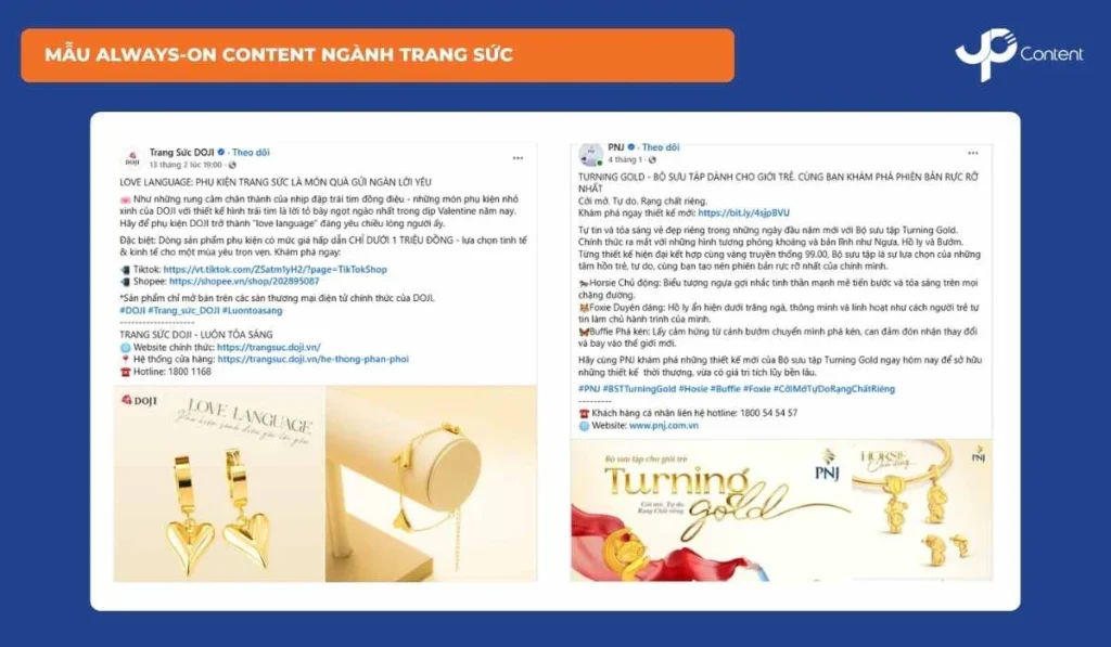 Trang sức mang giá trị biểu tượng cao, tác động đồng thời đến cảm xúc và lý trí. Content trang sức phù hợp với Branding (câu chuyện bộ sưu tập), USP (chất liệu, thiết kế, kỹ thuật chế tác), Social Proof (khoảnh khắc cầu hôn, kỷ niệm đặc biệt) và Inspire (ý nghĩa gắn với từng món trang sức). Storytelling cần tinh gọn, hình ảnh tinh tế để tôn lên giá trị và cảm xúc sản phẩm.