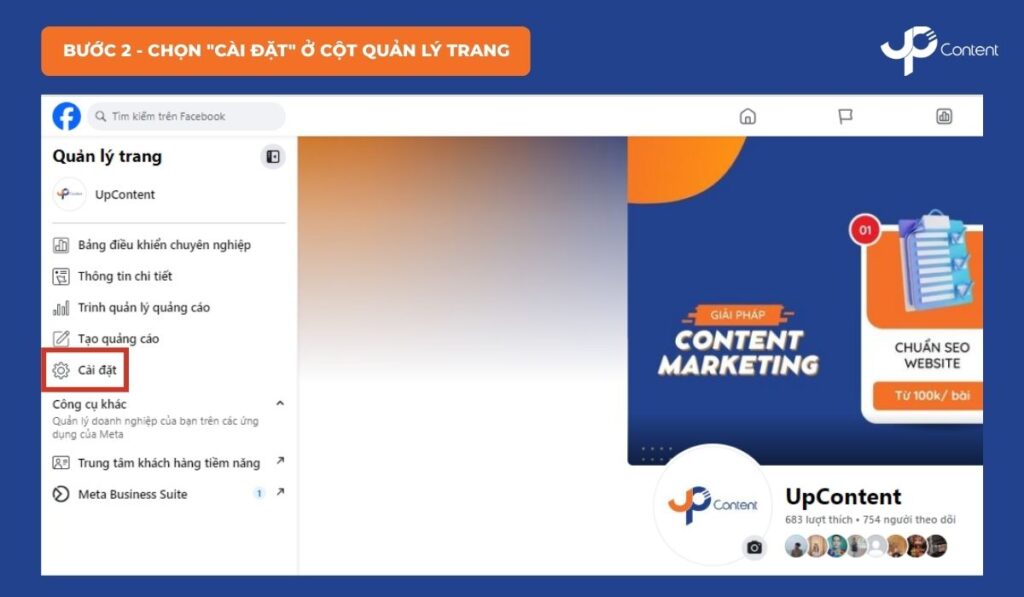 Bước 2: Chọn fanpage cần đổi tên từ danh sách. Trên giao diện trang, tìm và nhấp vào mục “Cài đặt” (Settings) ở menu bên trái màn hình.