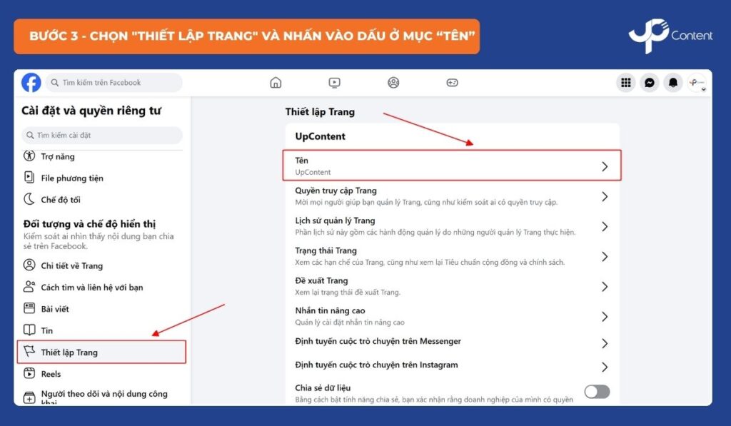 Bước 4: Trong Cài đặt, tìm và chọn “Thiết lập Trang” (Page Info). Nhấp vào trường “Tên” để bắt đầu thay đổi tên fanpage.