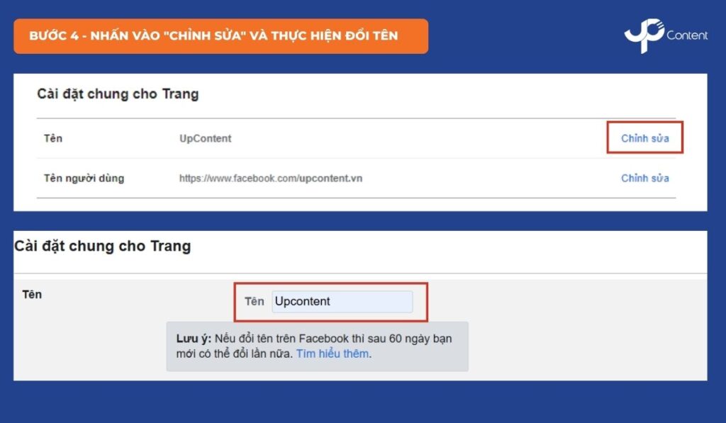 Ví dụ: Fanpage của bạn có tên “Marketing Agency UpContent” với URL là facebook.com/upcontent.vn. Khi đổi tên thành “Upcontent”, URL vẫn là http://facebook.com/upcontent.vn trừ khi bạn thực hiện thêm thao tác đổi username.