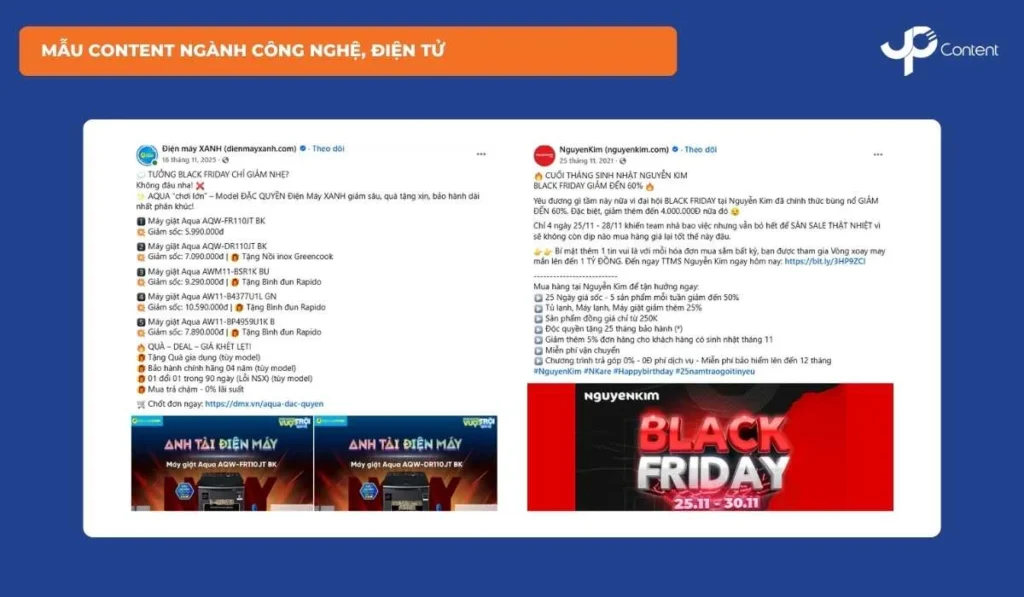 Ngành công nghệ, điện tử có chu kỳ mua sắm ngắn, khách hàng nhạy cảm với giá và thông số kỹ thuật, đồng thời có xu hướng so sánh rất nhanh trước khi ra quyết định. Vì vậy, content bán hàng Black Friday trong ngành này cần trình bày rõ ràng, trực diện và dễ đối chiếu. Nội dung cần minh bạch về cấu hình, phiên bản sản phẩm và thời gian áp dụng, giúp khách hàng hiểu nhanh và tránh nhầm lẫn trong ngày hội sale Black Friday.