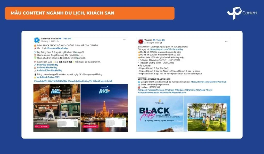 Đối với ngành du lịch – khách sạn, khách hàng quan tâm nhiều đến trải nghiệm, lịch trình và điều kiện sử dụng hơn là mức giảm đơn thuần. Vì vậy, content Black Friday và Cyber Monday cần tập trung làm rõ giá trị gói ưu đãi, thời gian lưu trú, quyền lợi đi kèm và tính linh hoạt khi đặt lịch. Nội dung nên kết hợp cảm xúc trải nghiệm với thông tin rõ ràng về thời hạn sử dụng, chính sách đổi ngày, hoàn huỷ, giúp khách hàng yên tâm chốt booking trong mùa sale.
