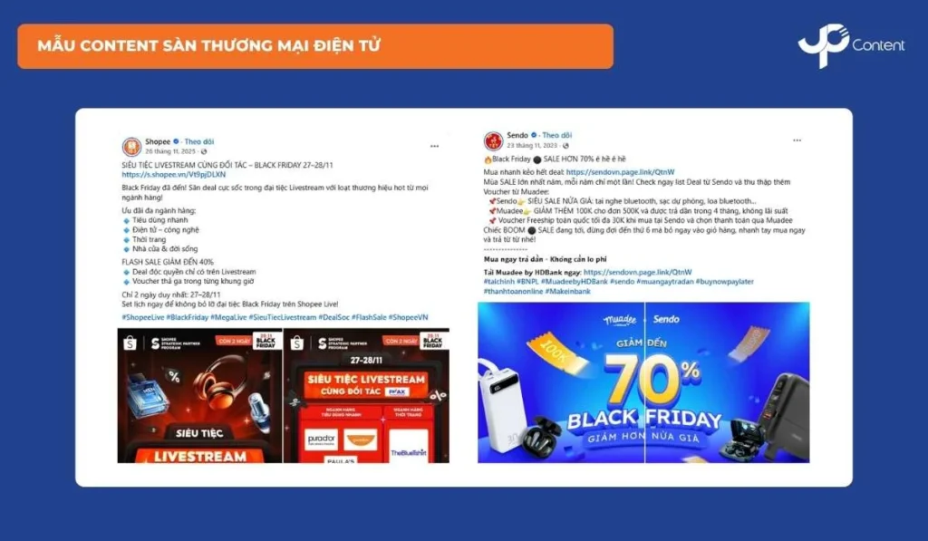 Sàn thương mại điện tử có đặc thù cạnh tranh cao, khách hàng so sánh rất nhanh và ra quyết định trong thời gian ngắn. Content Black Friday và Cyber Monday trên sàn cần ngắn gọn, trực diện và tập trung vào yếu tố chuyển đổi. Nội dung nên làm nổi bật mức giảm, thời gian áp dụng và quyền lợi đi kèm ngay từ tiêu đề và hình ảnh sản phẩm. Content nên cần ưu tiên thông điệp mua online tiện lợi, freeship, hoàn tiền và đánh giá người dùng để tăng độ tin cậy và tỷ lệ chốt đơn.