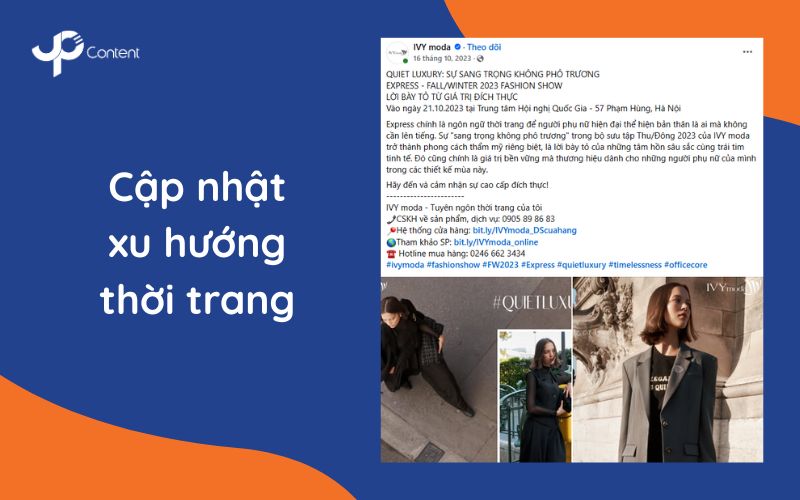 - Cập nhật xu hướng: Nắm bắt và áp dụng xu hướng mới nhất trong ngành thời trang vào nội dung của bạn. Việc liên tục cập nhật giúp thương hiệu luôn nổi bật và phù hợp với thị hiếu của khách hàng.