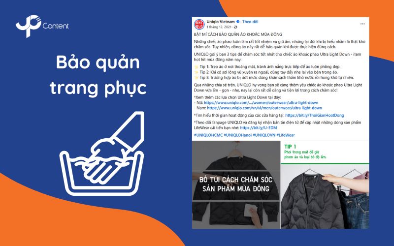 Thương hiệu sẽ chia sẻ những mẹo chuyên nghiệp về cách giặt, ủi, cất giữ và bảo quản quần áo theo từng chất liệu. Nội dung này giúp tăng giá trị vòng đời của sản phẩm, tăng sự hài lòng của khách hàng, giảm tỷ lệ đổi trả và xây dựng danh tiếng về chất lượng sản phẩm.